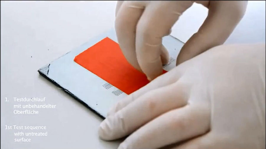 3.將膠帶貼合于涂層樣板中心位置,并確保于涂層完全接觸,迅速連續(xù)扯離