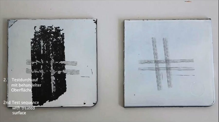 4.根據(jù)漆膜脫落的情況做附著力評(píng)判,(沒(méi)使用附著力促進(jìn)劑和使用了附著力促進(jìn)劑之后的效果對(duì)比)